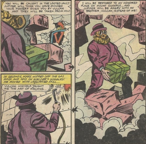 SoV wakes up and prays to Vulcan for a power boost, and said prayer is granted. When he busts out he heads back to foil Kong and Mars, but this time he’s gassed and sealed in a vault. Strike two for SoV. Not only is Mars sporting a Wesley Dodd Signature Brand Gas Mask, but he also knows his welding: