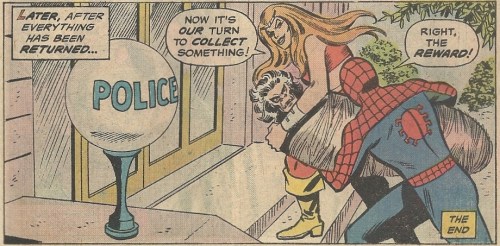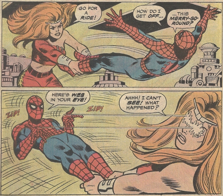 They wrestle around, perhaps fulfilling some “small masked man, large woman” fetish, and Spider-Man shoots her in the eyes with his goo — rereading that, maybe they need to rethink the whole Rated G business, though it really isn’t as bad as it sounds: