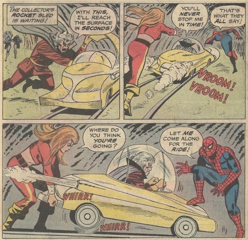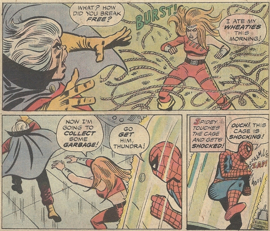 It’s revealed that the machines were teleported away by the Collector, and he soon tries to add Spidey and Thundra to his holdings. Not so fast, bub — and let’s sprinkle in some weak dialogue while the comeuppance is ladled out: