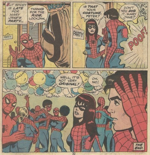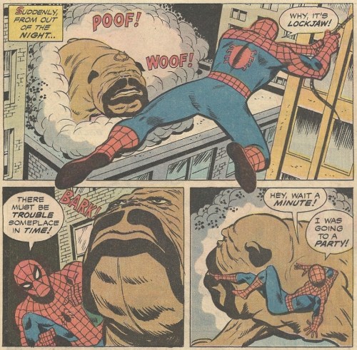 Peter’s heading to meet Mary Jane to go to a costume party (he’s pretty lazy in his costume selection — one hint: he’s wearing it) when Lockjaw appears and Shanghais him: