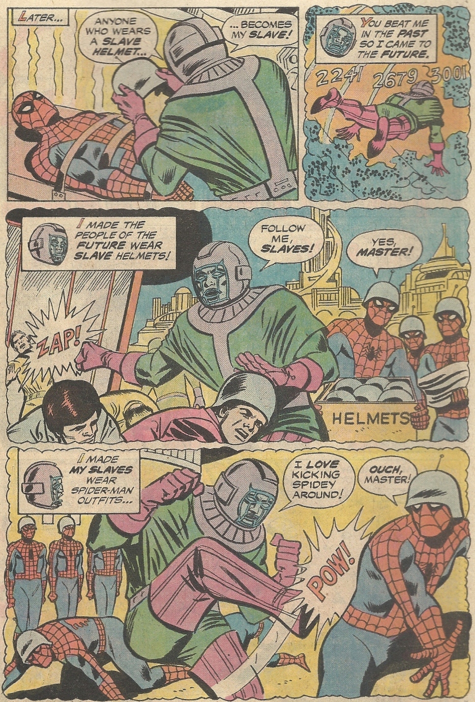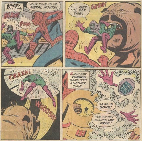 They travel to a future where humanity has been enslaved by Kang and forced to wear Spider-Man costumes. I shit you not, folks. I’ll leave it to Kang to explain this mishegoss: