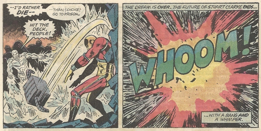 Clarke, scared to death about going to prison, wages a desperate fight (including deploying the jet pack seen on that Jack Kirby cover) but is no match for the combination of the law and the heroes. He decides to not go quietly into that good night: