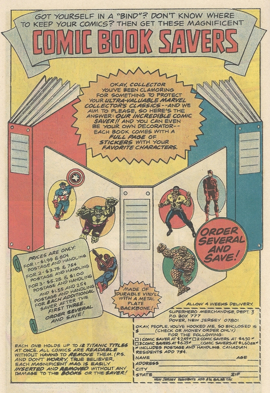 Did anyone out there use these 1970s-era Marvel binders? Were they bad? Good? The comic book version of a medieval torture rack? My first thought was that (*gasp*) you might have had to punch holes in your comics to insert them. Closer inspection would indicate that that wasn’t the case, but I’m still curious.