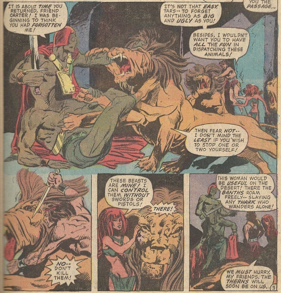 The Carter half (Script: Marv Wolfman, Pencils: Sal Amendola, Inks: Joe Orlando) is packed with the expected Banths, Therns, scantily-clad alien femmes fatales and double-torsoed creatures: