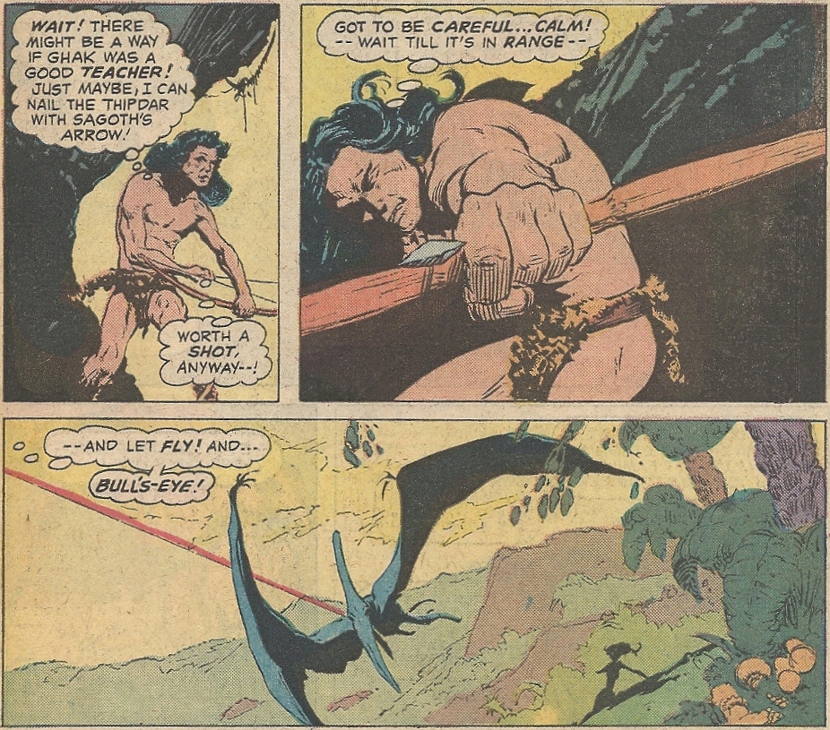 The David Innes story (Script: Dennis O’Neil, Art: Michael Kaluta) has our hero and his companion, Professor Abner Perry, escaping from saurian Mahar captors and Innes rescuing a hot broad from a pterodactyl, as seen on the cover. The art is a bit more steady, and one can’t help but admire a panel that shows a pterodactyl being brought down with the distressed damsel in silhouette: