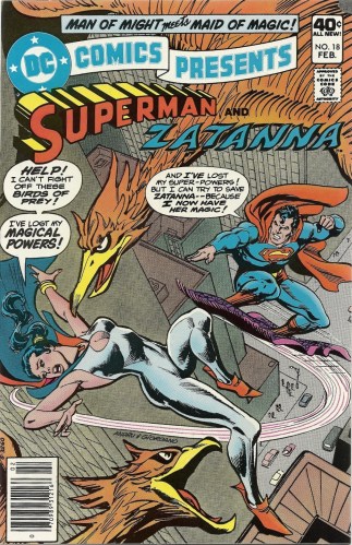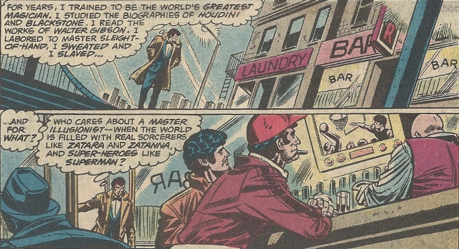 This brings us back to that downtrodden illusionist, who now suddenly has honest to God magical powers. He uses them to summon Zatanna and Superman so that he might gloat and have his revenge, and when Zatanna is menaced by giant birds, Supes gets a bit of a surprise: