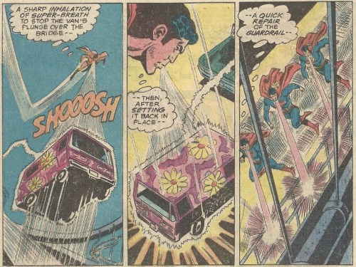 “The Night It Rained Magic!” (Gerry Conway, Dick Dillin & Frank Chiaramonte) opens with Superman preventing a generic version of the Scooby-Doo gang’s Mystery Machine from careening over a bridge: