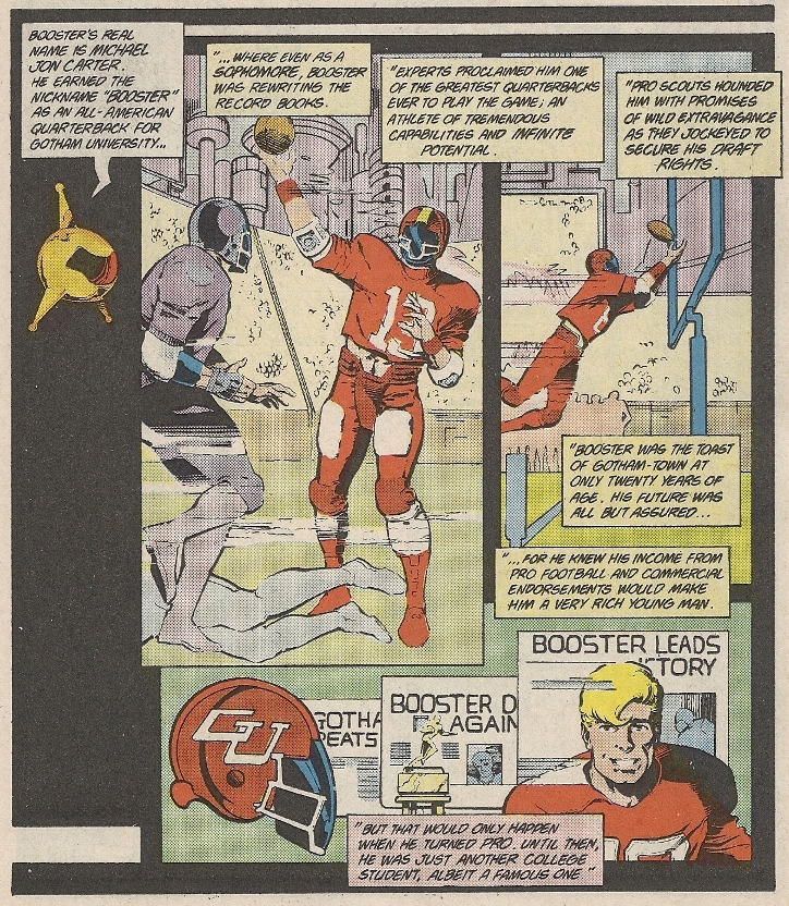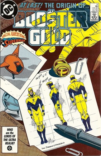 For this puzzler, I really can’t think of any better place to make a start than a book that boasts the first telling of Booster’s origin, written and pencilled by character-creator Dan Jurgens (with inks from Mike DeCarlo). It comes in the early days of the title and the character, as the Booster Gold mythos (commercialism fused with attention-seeking heroism) was still being fleshed out. But maybe it can give us some clues. Let’s put on our Sherlock Holmes hats, stick a meerschaum pipe in our mouths, pull out our magnifying glasses and get down into the marrow of this conundrum.