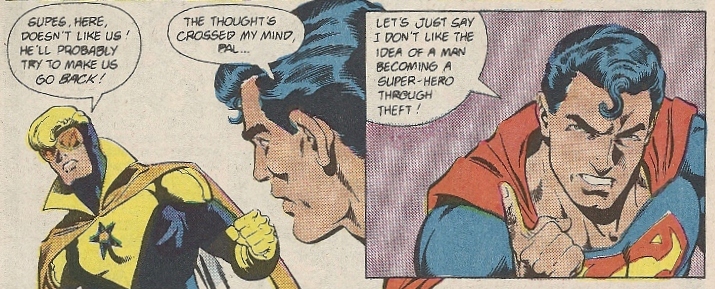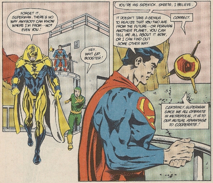 Superman is, however, not all that thrilled with Booster and his fame-whore ways. His harsh words hit Booster hard, and a “What’s his deal?” aside to Skeets opens up the little future-machine’s revelation flood-gates — remind me to never confide any dark secrets to hovering robots: