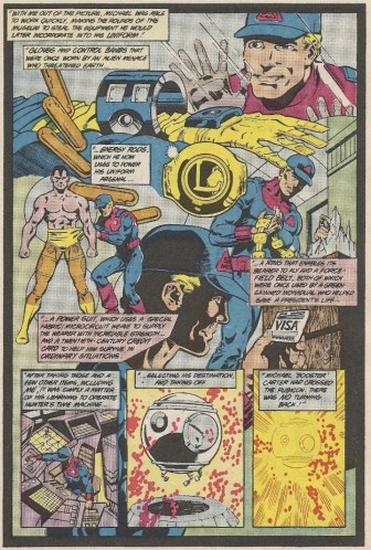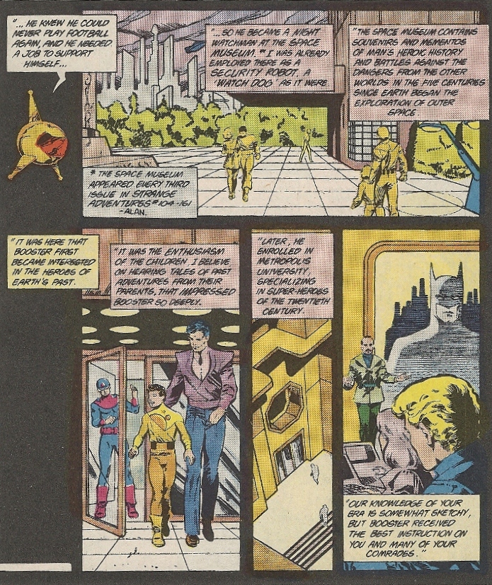 It’s not long before Booster gets the bright idea to travel back in time and make a new, heroic life for himself. To that end he disables Skeets (a fellow museum guard) and gathers up the tools of his new trade: