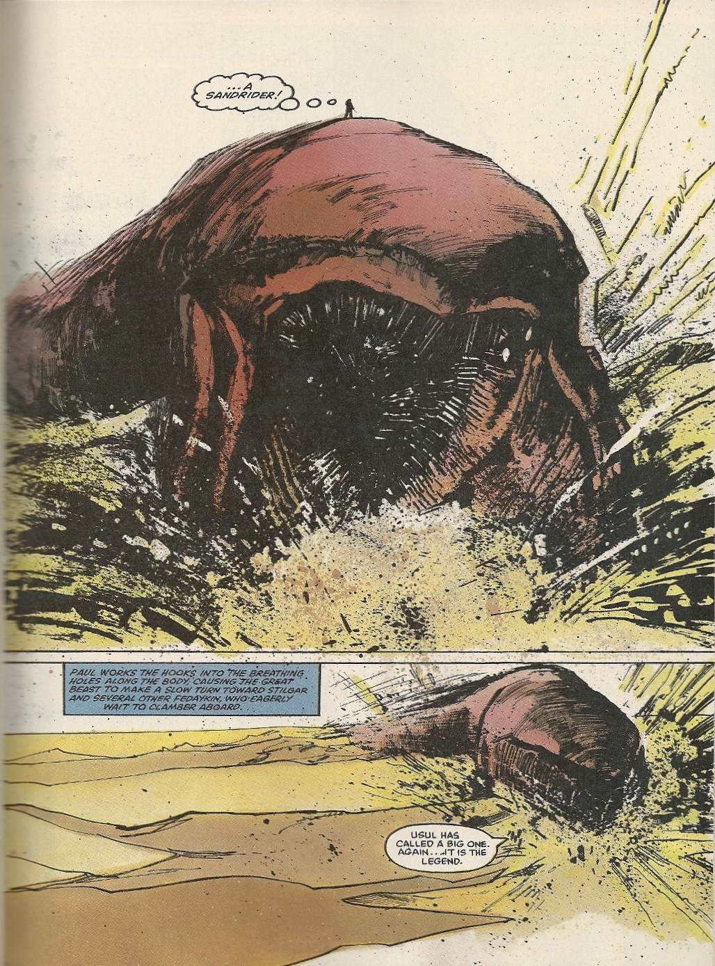 Sienkiewicz also handles some of the more should-be-awesome moments of the story better than the film. The first appearance of a sandworm as it destroys a spice extractor is a major milestone in the movie. It’s when we finally meet one of the great monsters of the universe, but the effect falls a bit flat. There’s lightning and a sandstorm, but the maw of the worm remains mostly submerged as it slowly gobbles this mechanical interloper: