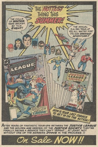 In light of the recent heat wave I’ve been sweating through, this ad seemed quite appropriate. Kind of makes you wistful for the days of yore, doesn’t it? A simpler time, when you could look forward to comics, including classic JLA/JSA crossovers, without dreading another lame retooling of venerable characters.