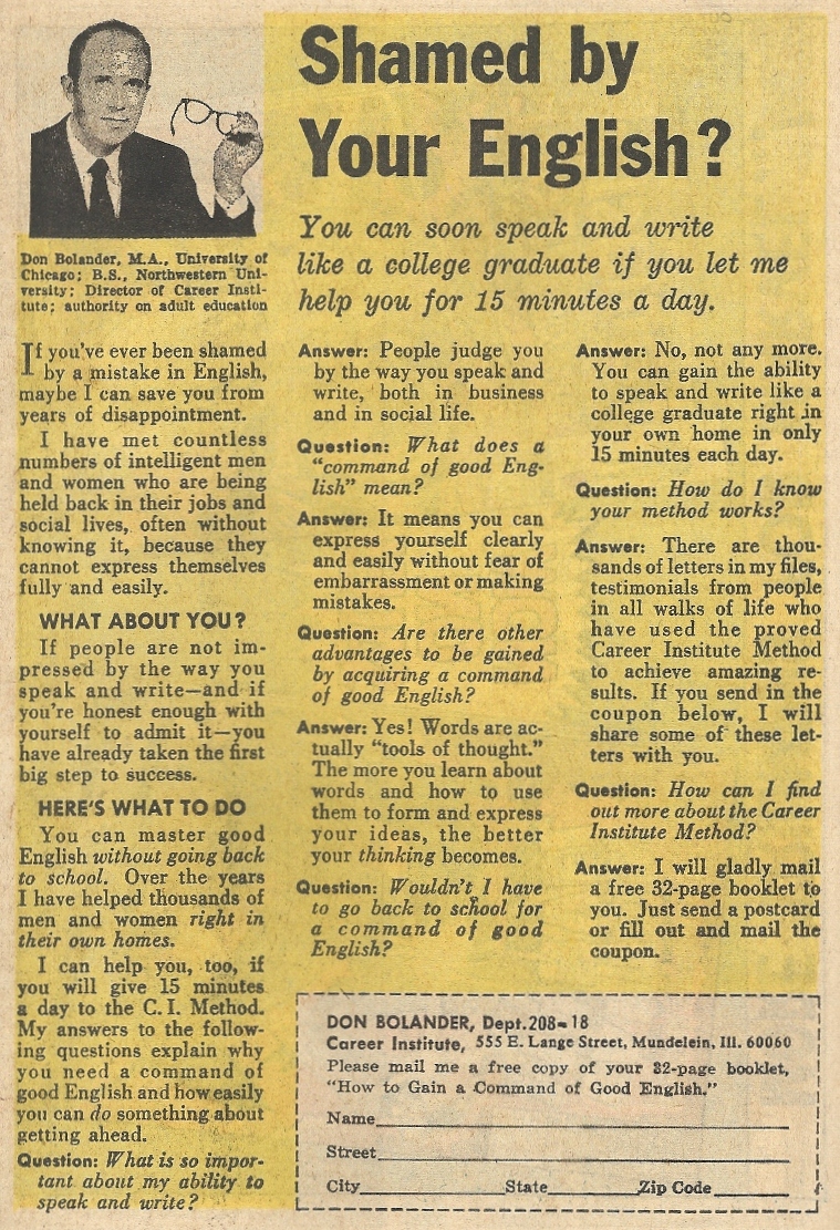 This is one of the many “Shamed by your English?” ads that used to appear in comics. I’m not questioning the credentials of Don Bolander, but I’ve always been curious how a pair of glasses awkwardly held to the side promoted the premise that this was a man not only of intelligence, but one who could take the shame out of a person’s reading game. A cursory Google search shows that Mr. Bolander made this pitch from the early ’50s up to the ’70s (at least) in not only comics but also magazines ranging from Popular Mechanics to Ebony, often accompanied by that very same (sometimes reversed) picture. It was plagiarized and spread across the Atlantic, in an early version of “going viral,” and was also parodied in Alan Moore’s wonderfully nostalgic (and subversive) 1963. Quite a career for a simple advertisement and its variants.
