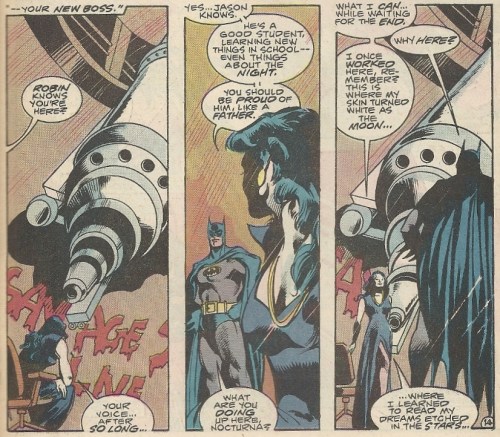 Robin gets in between Bullock and Nocturna, and later, back at the station, our grizzled gumshoe ruminates with Commissioner Gordon about the relationship between the Boy Wonder and this dairy-skinned dame: