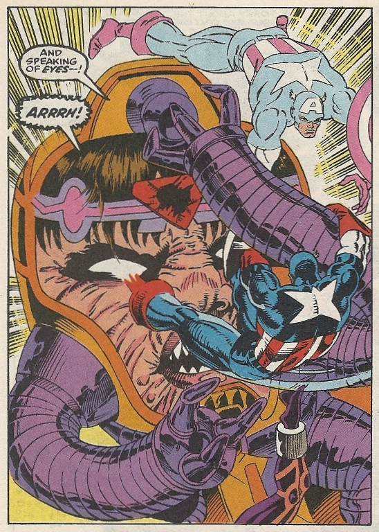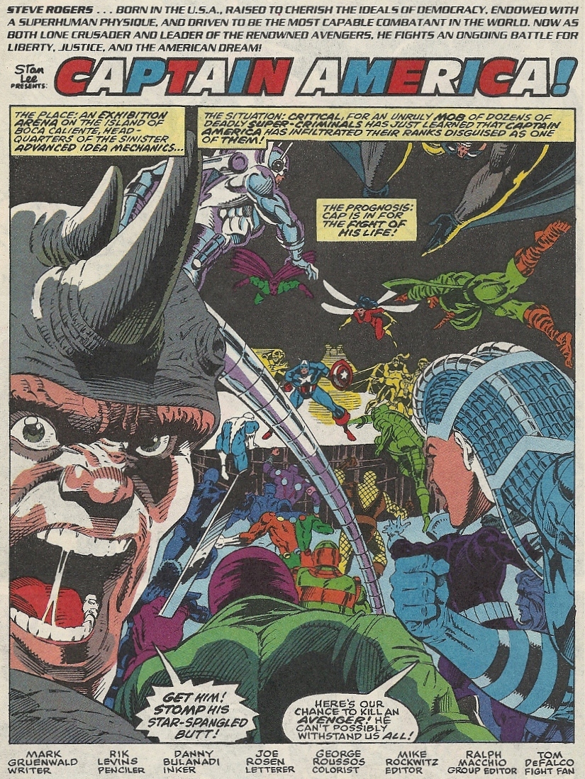 This issue (Mark Gruenwald/Rik Levins/Danny Bulanadi) had Captain America squaring off against any number of second-tier (and lower) Marvel villains, as shown in this opening page blast: