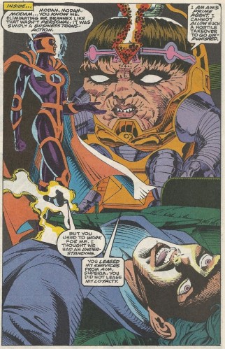 M.O.D.A.M. was essentially M.O.D.O.K. with redder lips, sharper teeth, longer, more functional arms (sort of like Doctor Octopus tentacles) and a little metal brassiere for her withered, shriveled breasts. The basic look, hovering chair, bad attitude and awful Bill Gates haircut were still there. That’s about all you need to know about her.