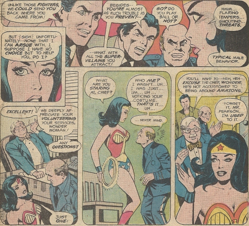 They’re in bad graces because of a disastrous, property-wrecking battle with the Silver Ghost, and Wonder Woman has been put on the case of tracking them down. Here she is getting her marching orders from old white guys, who are portrayed, perhaps fittingly, as chauvinistic worms: