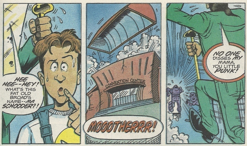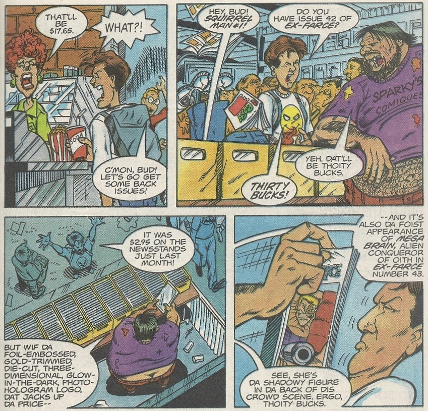 Bud heads of to the conveniently local con with one of his buddies to sell the Quantum Quartet and make his fortune. There he comes across every (justified) geek stereotype that you can imagine, many of which can be glimpsed on the cover. There’s also some rather delicious commentary at hand. These few panels skillfully encapsulate so much of what was wrong with the comic book world in the ’90s: