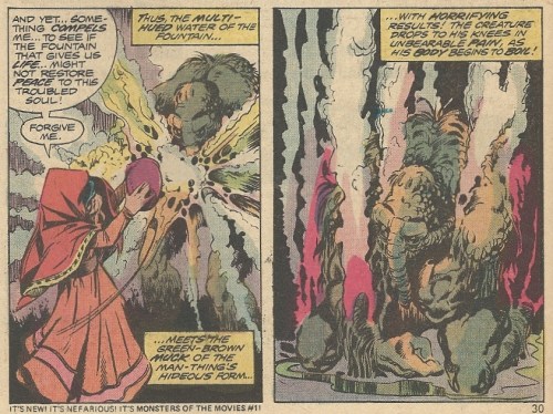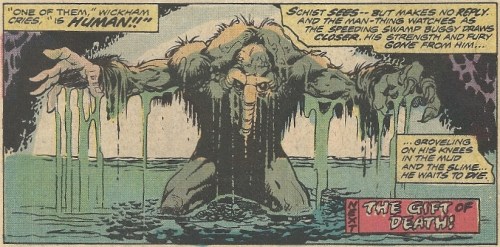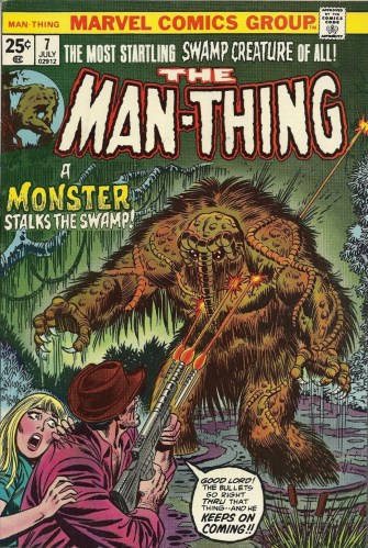 I only collected a few issues featuring Man-Thing (in Fear or his own title) and none of the first Swamp Thing series when they came out during my childhood, but later I got much into both of them and never worried about which one was supposedly ripping off the other (and they were both “ripping” off the Heap, who had recently been brought back in a Warren magazine from Golden Age obscurity (and the Heap in turn was inspired by a Theodore Sturgeon pulp story). Man-Thing, under Steve Gerber, usually had the better writing while Swamp Thing, with Bernie Wrightson, had the better art, but I enjoyed both. Of course, Alan Moore’s run on Swamp Thing, particularly with Steve Bissette and John Totlebon on art, significantly upped the ante on great muck monster comics.