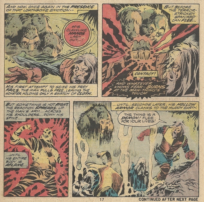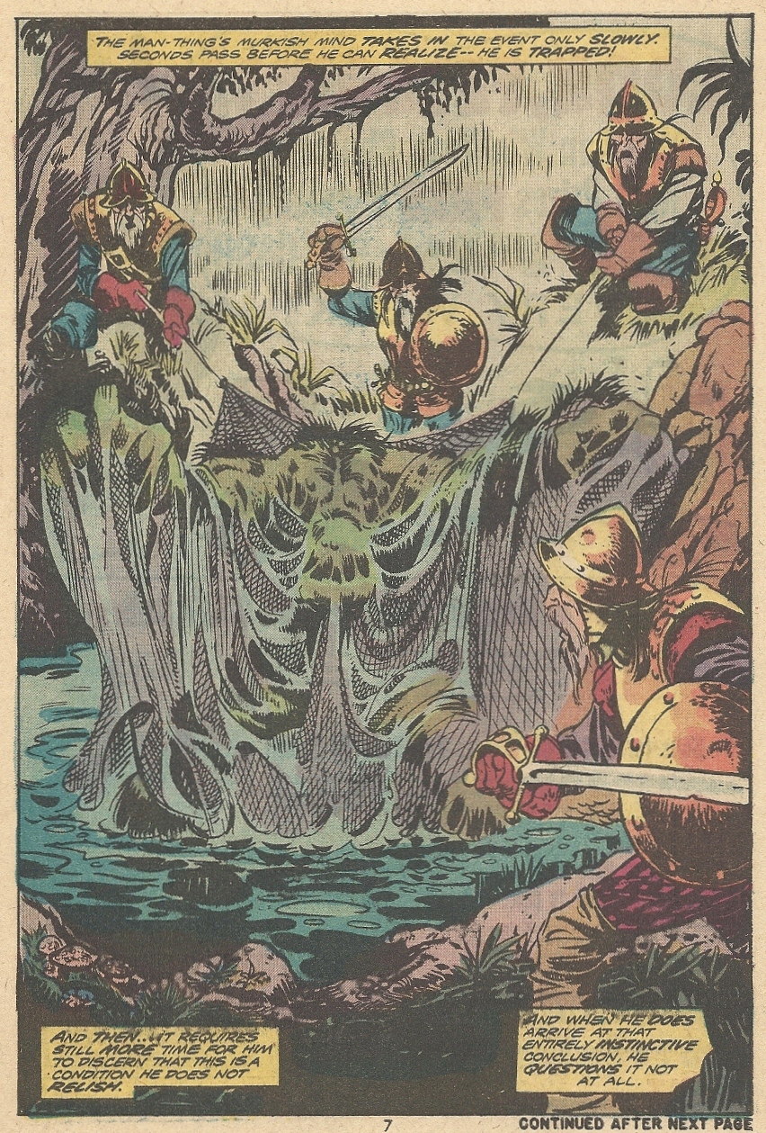 “The Old Die Young!” (from Steve Gerber and the perhaps appropriately named Mike Ploog) begins as I would have imagined it would, with Man-Thing watching from a distance as a developer pulls up stakes and abandons his attempts to build a runway in the swamp. It seems that there’s always an element of the “crying Indian” in these. Then the story takes an odd turn when Man-Thing runs into, of all people, honest-to-God conquistadors: