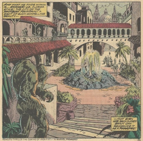 The conquistadors retreat to their “hacienda,” and Man-Thing follows hot on their heels. The hacienda winds up being a bayou Shangri-La, or at least a low-rent Lost Horizon set: