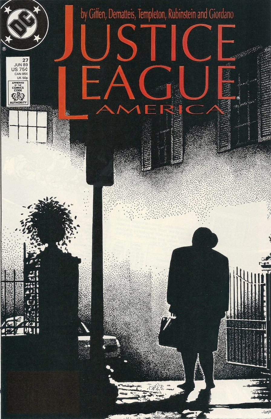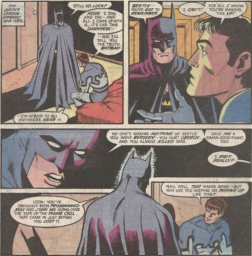 Today we delve into the depths of the Justice League “BWAHAHAHA!” days, with an issue forged by Keith Giffen (Plot & Breakdowns), J.M. DeMatteis (Script), Ty Templeton (Pencils), Joe Rubinstein and Dick Giordano (Inks), with Kevin Maguire handling the tribute/swipe cover. The blocky, bitchy Amanda Waller steps into the Father Merrin role here, though she’s not out to exorcise any demons. She’s summoned to get to the bottom of whatever’s caused the Blue Beetle to lash out and injure his fellow Leaguers, as recounted here by Batman: