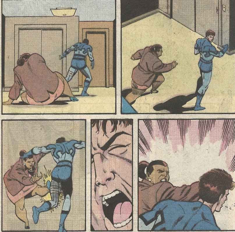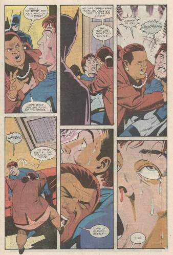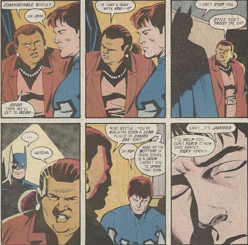 Waller heads over to the room in the J.L.A. HQ where Ted Kord is being held. She goes in sans holy water, and Kord apparently has no pea soup in his innards. If you’re curious. The meeting with Beetle starts off slowly: