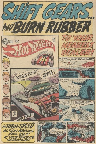 This is one of those Johnny Carson “I did not know that” moments of which the comic book world appears to have a never-ending supply. I had no clue there was such a beast as this until the above ad slapped me in the mug. Tiny metal toy cars seem like a rather thin broth to build a comic around, and sort of remind me of Pole Position, the most boring Atari 2600 game I ever owned and the basis for one of the more insipid cartoons of my youth. Actually, this comic was more of a tie-in to a late-1960s Hot Wheels cartoon, so that comparison is perhaps a bit more apt than at first blush.