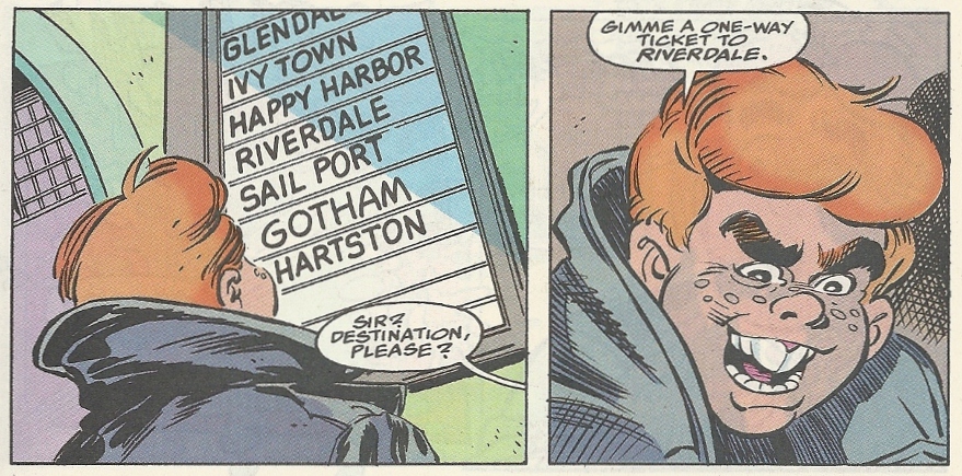 Batton Walsh wrote this little ditty and Tom Palmer inked, while John Buscema and Stan Goldberg split pencilling the respective Punisher and Archie halves. The excuse for this collision of worlds comes when an Archie look-alike gangster that the Punisher is stalking heads to the whitest town in America — there’s a real Clint Howard/Ron Howard dynamic between “Red” Fever and Arch (and please note the other fictional potential destinations):