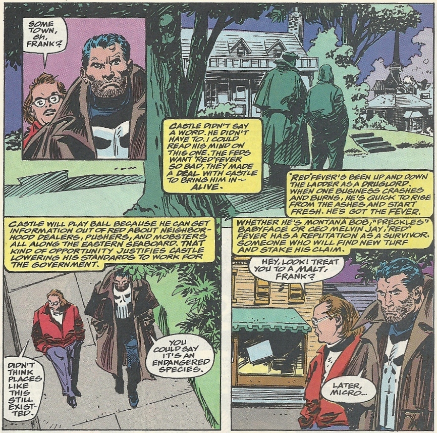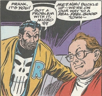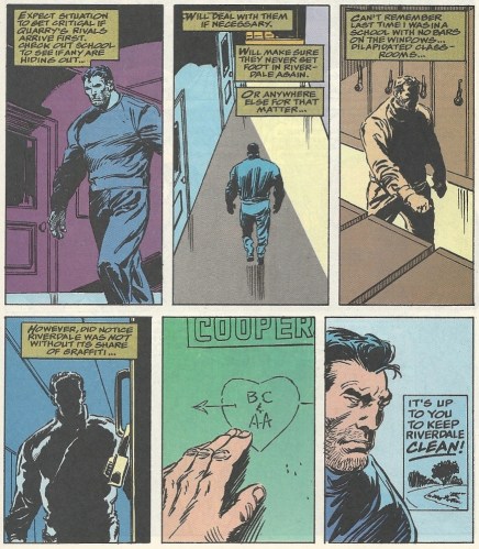 It’s not long before the Punisher finds out where he went, and he and the brainy Micro make the typical fish out of water when they walk down Riverdale’s tree-lined streets: