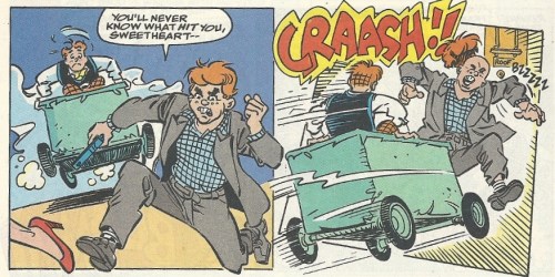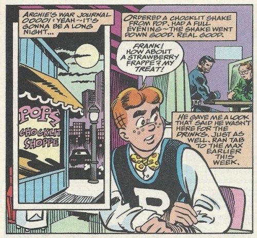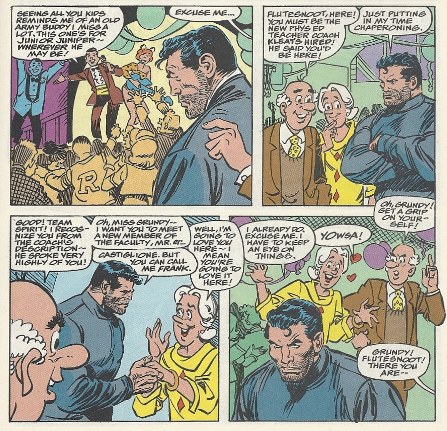 Archie slips away when the other gangsters fight back and he eventually works his way to the dance (Josie and the Pussycats are the featured performers, of course). Frank goes there too, and I was a bit surprised by the genuine poignancy of these panels, as he walks through the quiet halls: