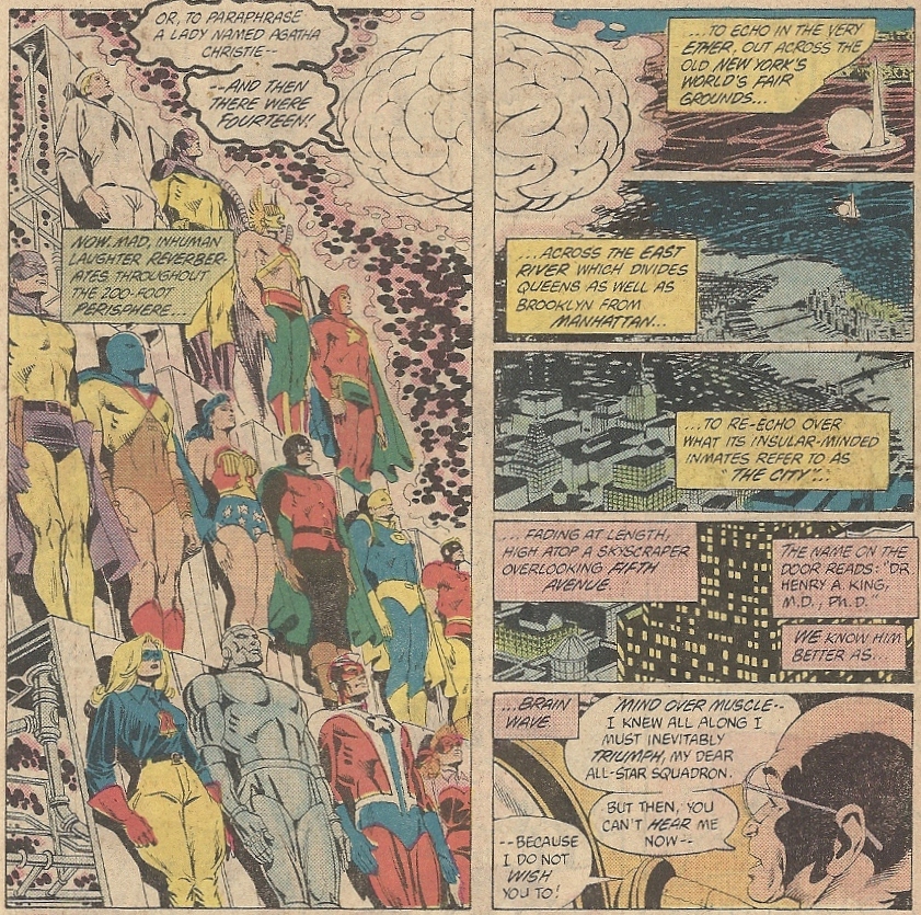 The strength of his anger and will has overwhelmed Brain Wave and his machinery, freeing the other members of the Society from his clutches. But there’s some “rule” that if he dies, then all the other formerly brain-zapped heroes will die as well (a weak point in the story, but I’m willing to let it slide). This is a problem, because his dreaming consciousness comes close to offing himself with that murderous ring. He’s pulled back from the brink by his cohorts in the nick of time: