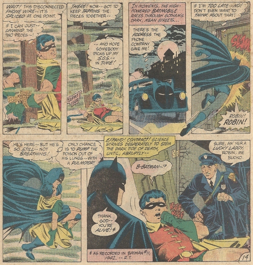 Meanwhile, the younger half of the Dynamic Duo has been tied to a post by the Joker and gassed, followed by a narrow escape from death (all from Batman #17):