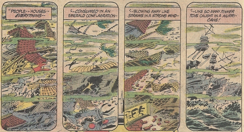 Back to the core stuff. Brain Wave had summoned the trapped heroes with a Morse code challenge (hence the reason for showing what the other leading lights are up to), and the Green Lantern responds belatedly. Before he can free his friends, he too is trapped in this virtual shared dream. When he finds his pals and allies dead, he does not react well:
