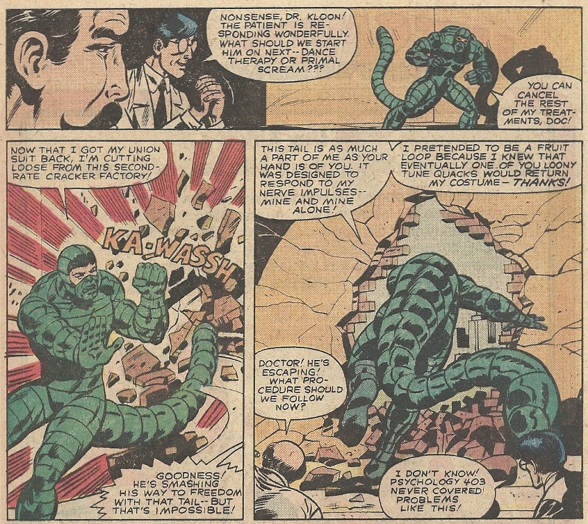 In “A Savage Sting Has — the Scorpion!” (Script: Tom DeFalco, Pencils: Herb Trimpe, Inks: Mike Esposito, Cover: Frank Miller) the threat that brings them together is that resident Marvel nut-job. Locked up in an asylum, he plays mental possum and dupes some unbelievably gullible doctors into letting him back into his suit as a form of therapy. This has the expected result: