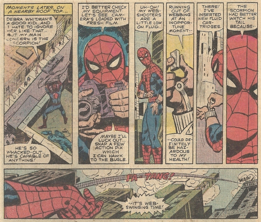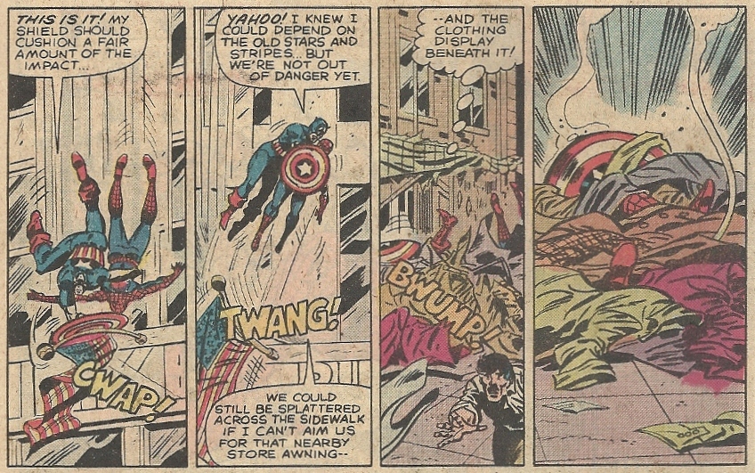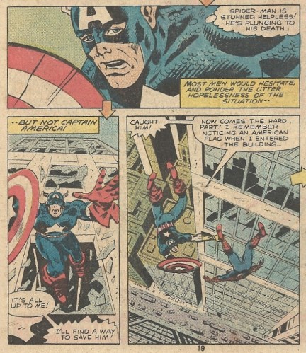 I should also add that, as much as I like Trimpe’s Silver Age art, I’m less enthused about some of his later output. This includes his stuff here. It’s still solid, but there’s a certain stiffness to it that holds it back. Perhaps a disconnect with the inks, I don’t know. That said, I can’t take anything away from his staging of Cap and Spider-Man tumbling out of a high-rise. It’s a great little sequence.