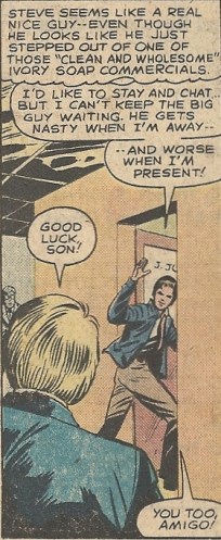 He has no luck on his search, but does manage to snap some shots of himself corralling other crooks. Later,when he heads to the Bugle to hawk his photographic wares, he runs into a certain broad-shouldered blond gentleman also plying his trade — Steve Rogers, who just finished showing Robbie Robertson some of his sketches: