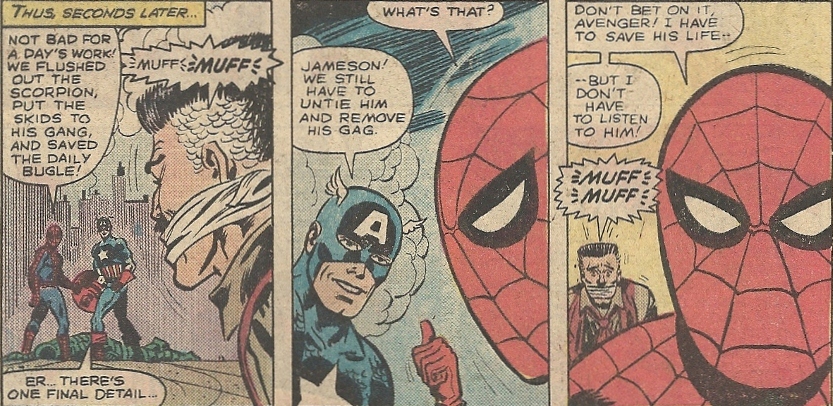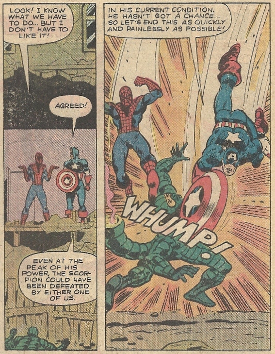 Scorpion, meanwhile, is on a collision course. He’s all pissed at J. Jonah Jameson, whom he (rightfully) blames for his mental plight (see: origin). He kidnaps him, which gets the attention of Cap and Spidey. Both make quick costume changes to meet this threat, but the younger of the two gets smacked, knocked out cold and bumped out of a smashed window. Captain America to the rescue!:
