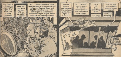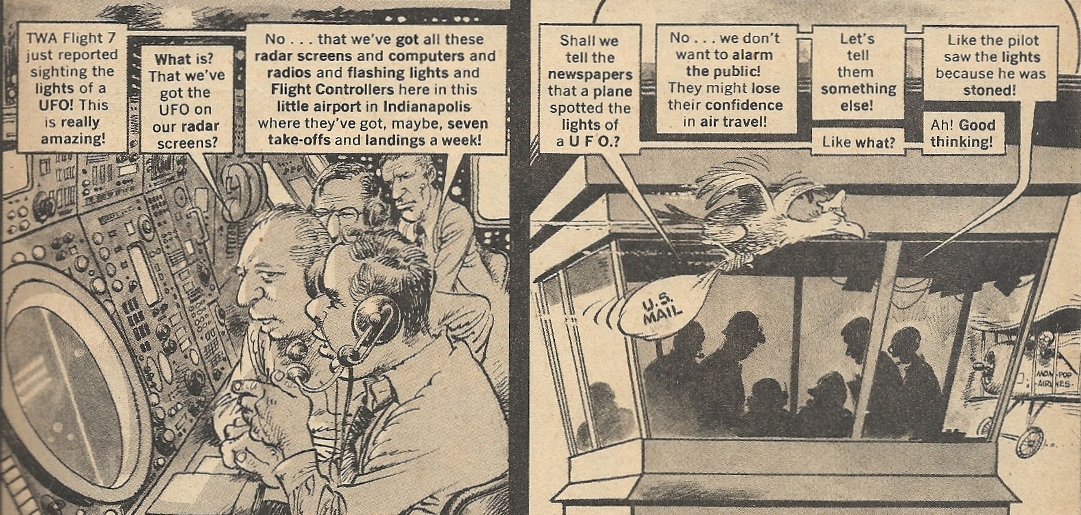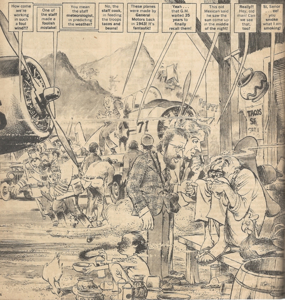 Here we have the first scenes skewered under the ministrations of Stan Hart’s script and Mort Drucker’s pencil and pen. There’s the windy WWII plane discovery in the desert, complete with flatulence and marijuana jokes: