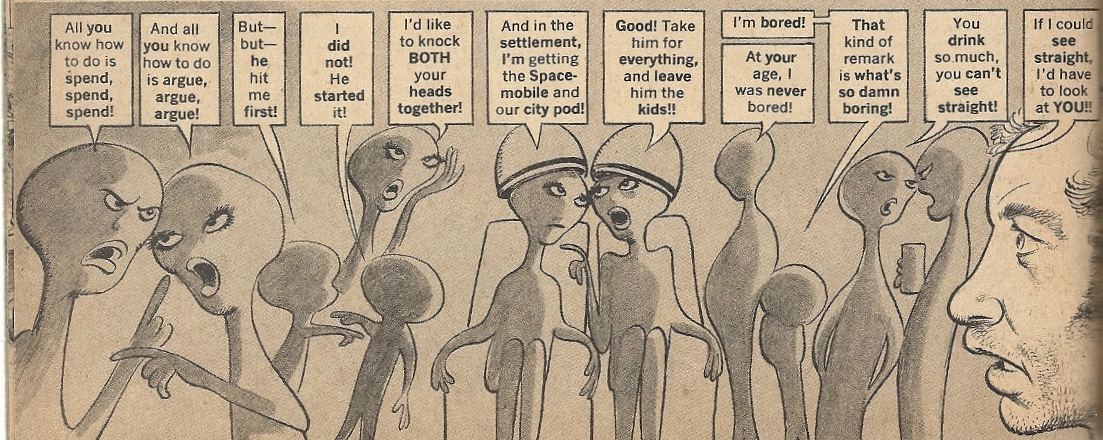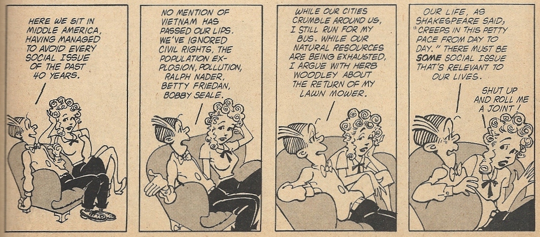 There was also a nice bit (Jack Rickard art, Frank Jacobs script) that had your everyday comic strips (Beetle Bailey, Dick Tracy, et al.) crafted with the intellectual posturing of Doonesbury. Here’s one with Blondie and poor Dagwood Bumstead reflecting on their social obtuseness:
