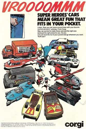 I was aware of, owned, and posted an ad for the Corgi fist-equipped Supermobile and the Super-van, but I didn’t know that there was an entire line of DC-themed vehicles. I do now. So Captain Marvel has a race car. Okay. And Wonder Woman zips around in a car that screams “Beverly Hills kept bimbo” (though it’s still not as femme as Wildcat’s pussy-cycle). Okay again. Perhaps the Penguin’s ride — with its (of course) umbrella — is the best of the bunch.