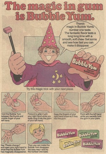 One would think that the real trick here was making a gum whose flavor would magically disappear seconds after being placed in your mouth. Huzzah! It’s gone! Bubble Yum was like Bonkers candy in its unabashed sugarfication, but you felt obligated to chew on it for a while even after the fruity tang high-tailed it out of there. That whole gum thing. The taste evaporation effect also applied to kindred competitor Bubblicious. The orange variety of that brand, which I chomped as a kid, was great for a couple blinks of the eye. Then it would morph into a wet pencil eraser.