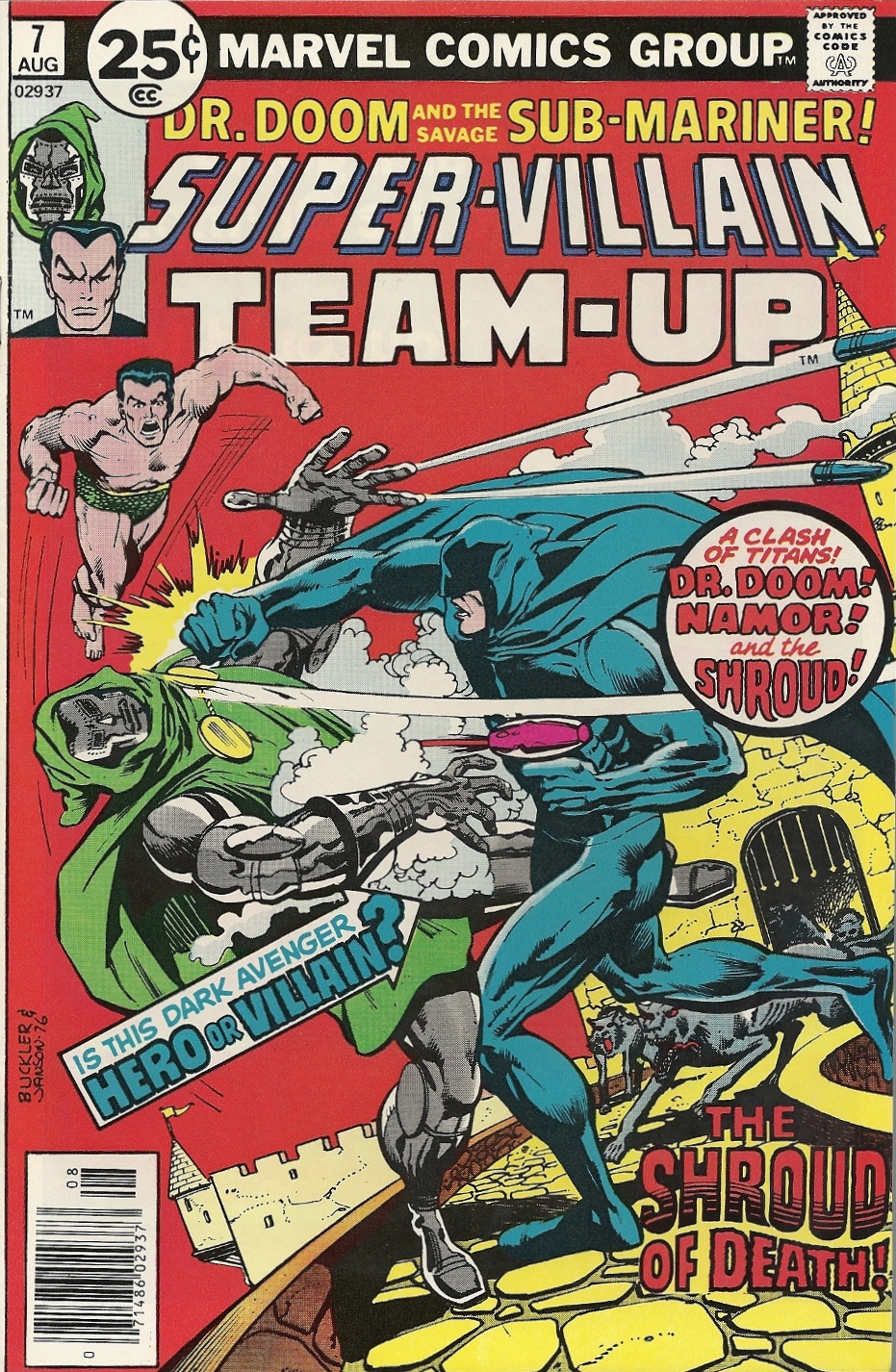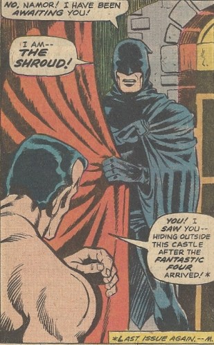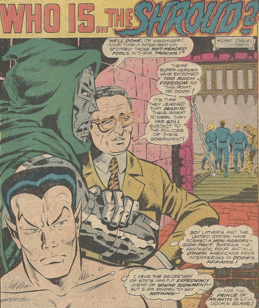 But one comic sometimes ain’t big enough for the both of them, and Namor spends most of this issue off-panel as the “slave” of Doom, due to a previous bad bargain (I like to imagine him losing a variant of the pro wrestling “loser leaves town” match). It’s unclear if this is “menial labor” slave or “leather and red ball in mouth” slave, but he’s a slave nonetheless. And though he spends most of his time sitting around in a Latverian sitz bath, there’s still a lot to keep a reader entertained in the Steve Englehart/Herb Trimpe/Pablo Marcos “Who Is…the Shroud?”