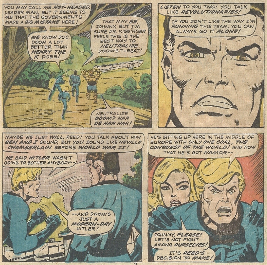 Doom has exploited Cold War tensions in a diabolic bit of triangulation and realpolitik, forging a treaty with the U.S. which allows them to focus their energies on the Soviets and ChiComs (I’d suggest they just call Thor). This puts the screws to constant Doom foils the Fantastic Four, who are expelled from Latveria with the U.S. government’s support and have a heated political debate as they depart: