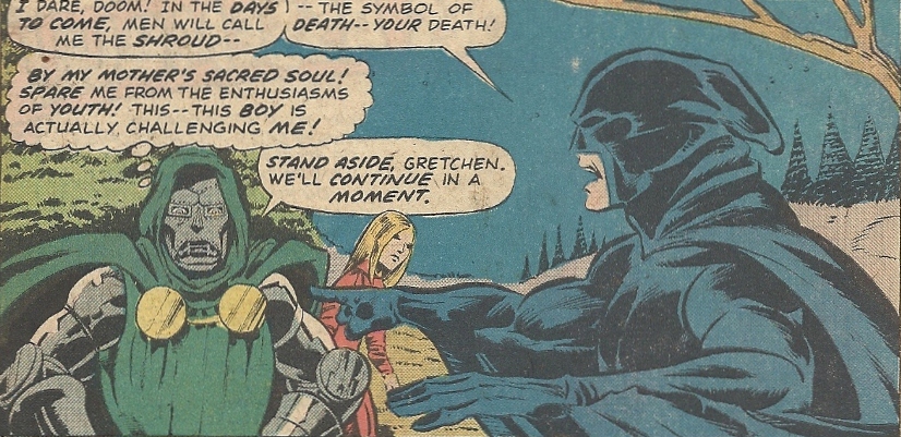 They square off, with Doom shouting his usual insults, the Shroud matching him bloviation for bloviation and deploying his Bat-a-ra-, I mean Bomb-a-rangs: