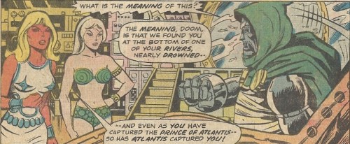 There’s stupid-stupid and then there’s stupid-fun. This is stupid-fun, a veritable horn of plenty in terms of 1970s Marvel goodness. Doctor Doom is a great villain, and an easy case can be made for him being THE villain, but part of his charm is that it’s so much fun to watch him fall flat on his metal encrusted face. He enslaves Namor. He bamboozles the Ford administration. He plucks a young babe from her loving family. And then he gets shoved off a cliff by his poorly trained mutts (at least it wasn’t squirrels) and thrown into bondage by broads wearing seashell bras. It’s like a simple, great Betty Crocker recipe. I wish I could read something new like this every damn day.
