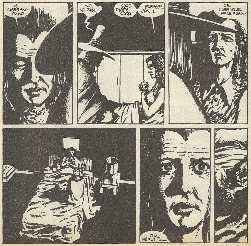 Oh yeah. That little “Remember remember the fifth of November” guy. In the above issue, as Moore had Miracleman knocking Big Ben into next week and stumbling upon the underground bunker that birthed him, and had the Warpsmiths zipping along in their own feature, V was gently poisoning one of his torturers and showing her (but not the readers, damn him) his true face:
