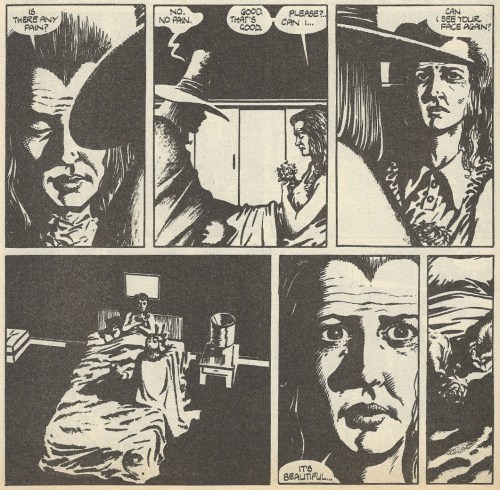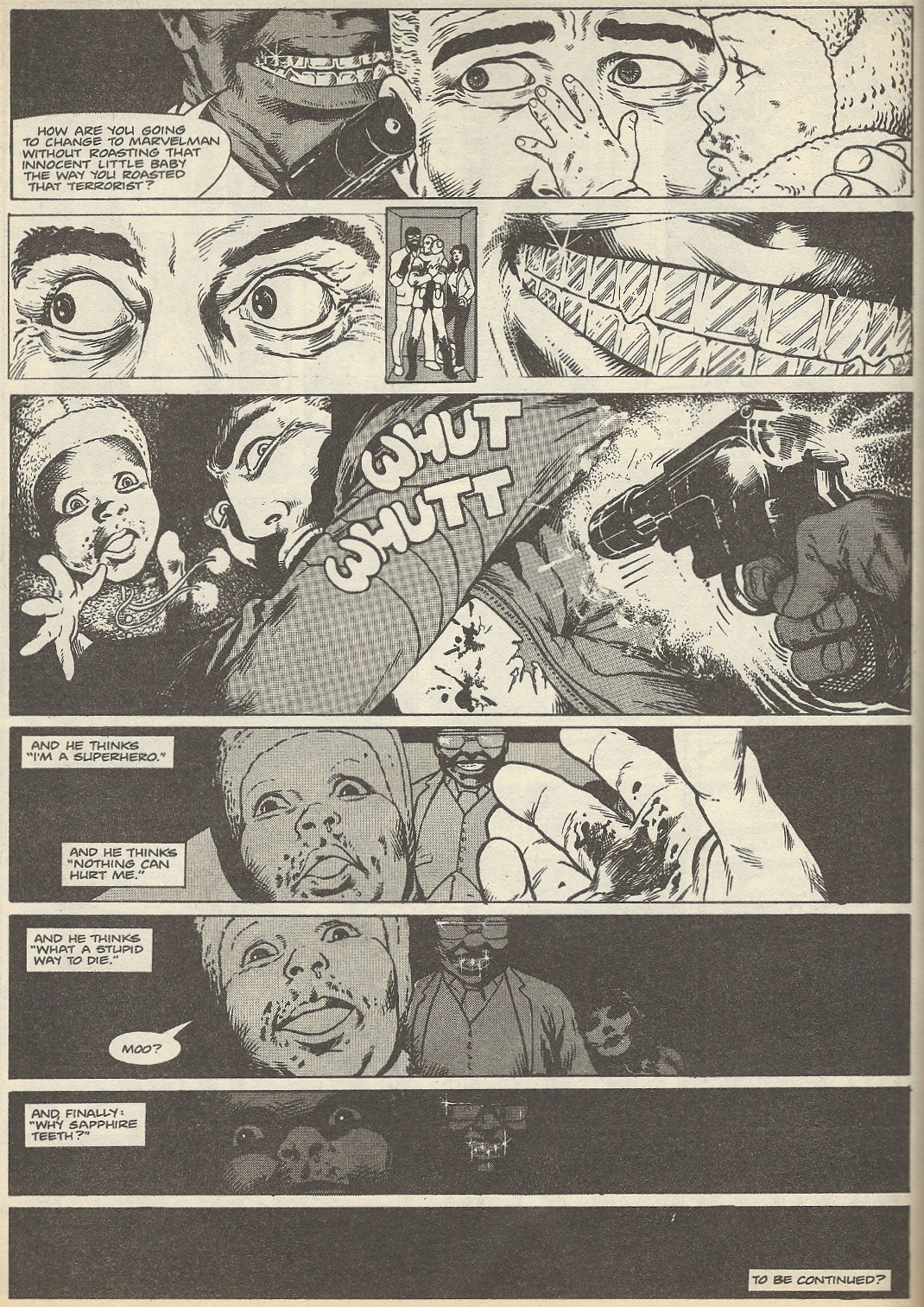 You know, I only had the first two of the Eclipse reprints as a lad, and they only got as far as those panels. I got a hold of the rest of the Miracleman series (delayed thanks to endless copyright garbage — thanks, McFarlane) a few years ago. So that messy baby and fade to black ending was the last chunk that I saw for a very, very long time. Quite a wait.