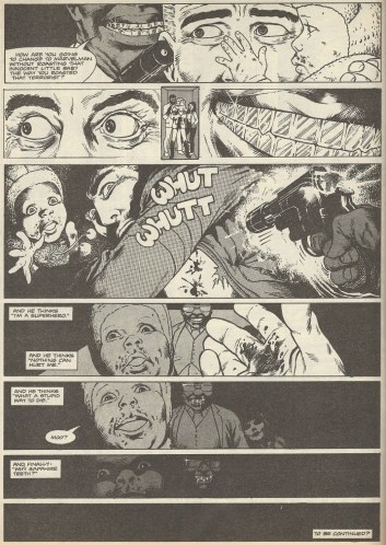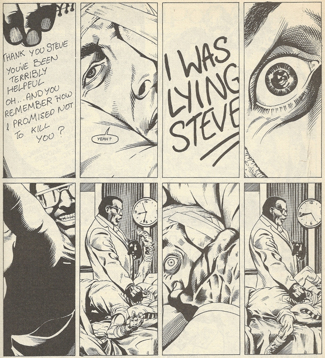 There was also this unquestionable high point of the early Miracleman saga, Cream’s crafty means of subduing a man who can become invulnerable at mere utterance of “Kimota,” from Warrior #8: