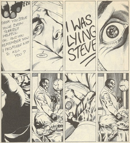 One satellite in the Miracleman system that sticks in the mind is that enigmatic assassin with the sapphire teeth, Evelyn Cream. In his later appearances he fell more into cliché territory, constantly harping on his blackness and the irony of serving and protecting an Aryan Zarathustra, a Hitlerian wet dream brought to life by the evil Dr. Gargunza. But those first impressions were stunning. He was a force of nature, a great white shark with the body of a fullback, odd orthodontia and eye-obscuring glasses. Here was our first clue to his — as Kevin Harlan would bark — “no regard for human life,” as he questioned the terrorist burned and struck deaf by Mike Moran’s first transformation (from #7):